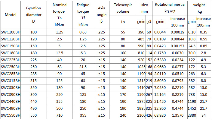 SWC-BH welded universal coupling : the connection of two different axis of the drive shaft, not cushioning and damping, the whole fork structure, fixed bearing without bolt, avoid fracture, loosen the bolts and prolong the service life, convenient maintenance, high reliability, large bearing capacity, high angle, can be in beta is less than or equal to 5 DEG 25 degrees under the conditions of work. It is suitable for rolling machinery, lifting transportation, construction machinery, petroleum machinery and other heavy machinery. To meet different installation requirements, there are seven structural types. Related products