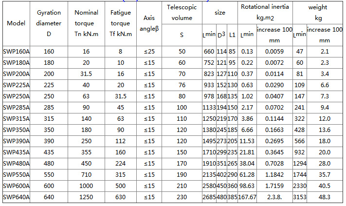 SWP-A telescopic long universal coupling Basic Parameters And Main Dimensions(JB/T 3241-2005)mm