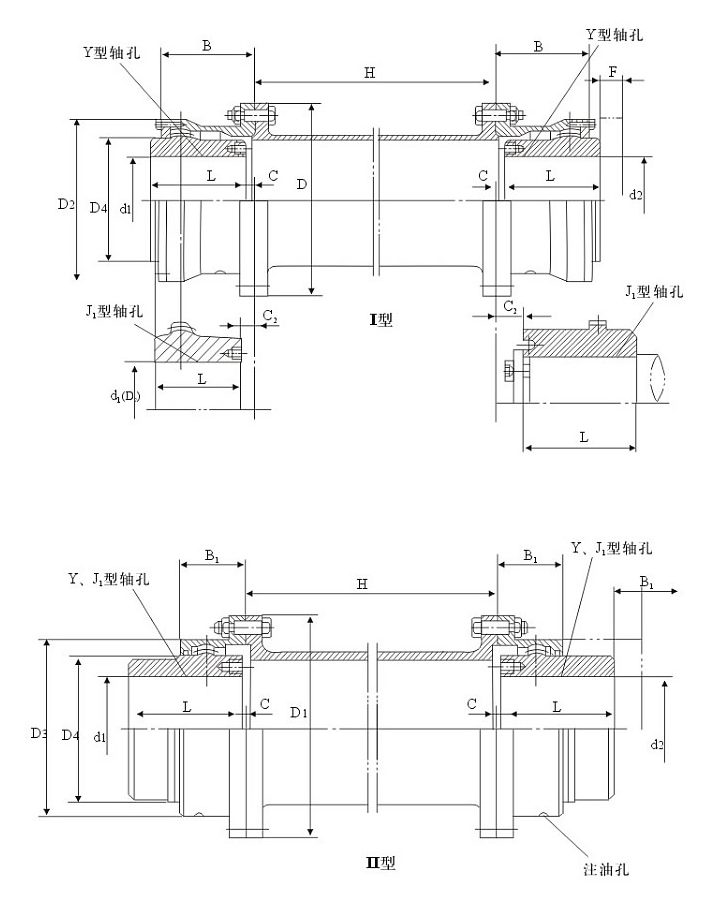 I - the sealing end cover is a separation type, with a large distance between the teeth. It can allow the larger radial displacement, and can be connected with the Y, J1 and Z1 type shaft.