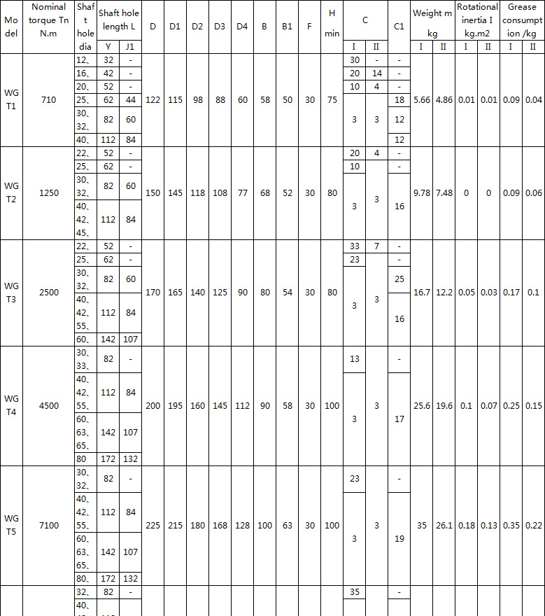 WGT drum gear coupling : with a small amount of axis offset compensation performance, can not be buffered and vibration damping. Small size, large torque transmission in theory, need to be lubricated and sealed, but the noise is large and the price is expensive. It is used to connect the two coaxial axis transmission. It is used for connecting horizontal two coaxial lines under low speed and heavy load conditions, such as metallurgical machinery, heavy machinery and so on. It is not suitable for high speed and high precision shafting transmission. It is not suitable for frequent starting and changeful working conditions. Related products