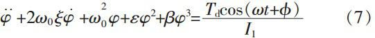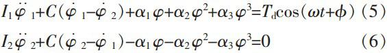 Figure 2 is the transmission system of a nonlinear grid coupling. It is shown that the excitation torque, Td cos (ωt+φ), is added to the driving shaft of a coupling. The driven shaft output at constant torque. The rigidity is nonlinear. According to the theorem of moment of momentum, torques on the both sides of a coupling are balanced so that we can get the differential equation of torsional vibration in the system:
